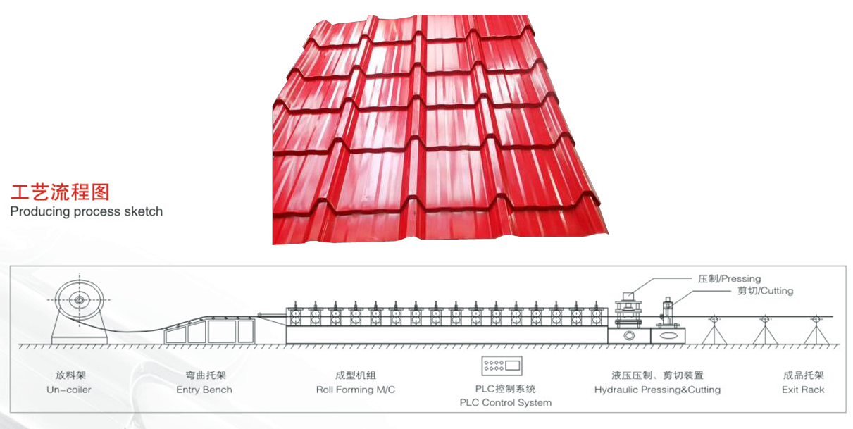 彩鋼琉璃瓦設(shè)備主要由放料機(jī)、進(jìn)料導(dǎo)入平臺(tái)、成型主機(jī)、沖模壓型裝置、成型剪切裝置、液壓站、電腦控制系統(tǒng)、成品托架等幾部分組成。