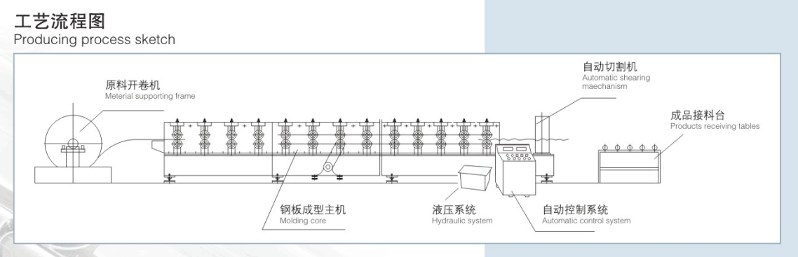 開(kāi)卷機(jī) 成型主機(jī) 液壓切刀 電控系統(tǒng) 液壓系統(tǒng) 出料架