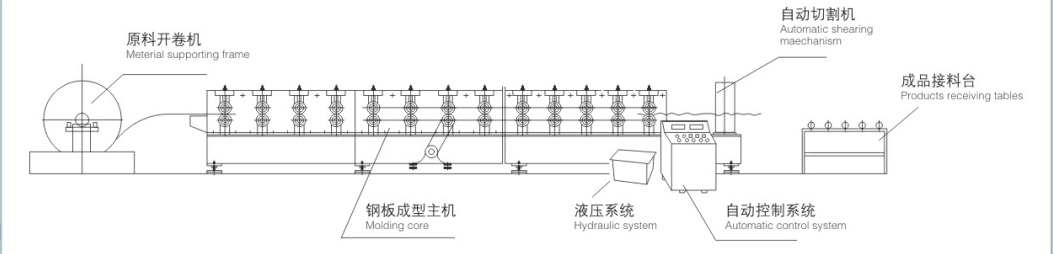該機主要由放料機、進料導(dǎo)入平臺、成型主機、成型剪切裝置、液壓站、電腦控制系統(tǒng)、成品托架等幾部分組成。